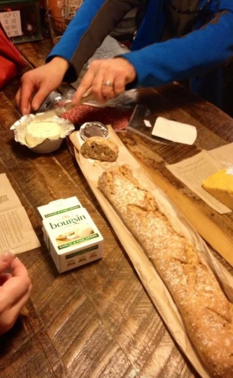 I grab a pear cider, Hubs orders another apple cider and we sit down to feast. Our meal is very European. It’s everyone at the table tearing bread, spreading cheeses, convincing each other to try different combinations of flavors. It was simple. It was cozy. It was satisfying. It was a good time for us all.